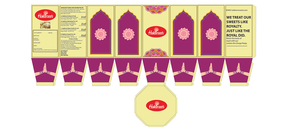 Our packaging concept for Durga Puja harmonizes tradition and modern elegance, featuring rich reds and golds with intricate Bengali motifs depicting Goddess Durga. Haldiram's Navratri special sweet box will be adorned with traditional sweets and sindoor, capturing the festival's essence in a visually delightful manner.